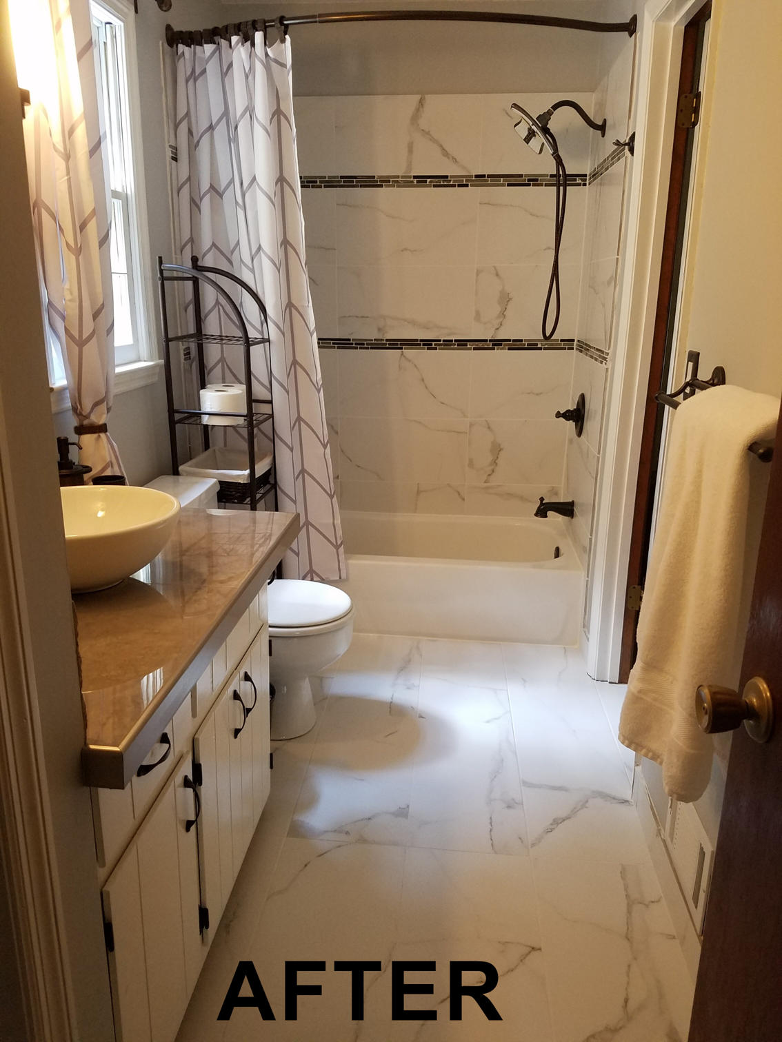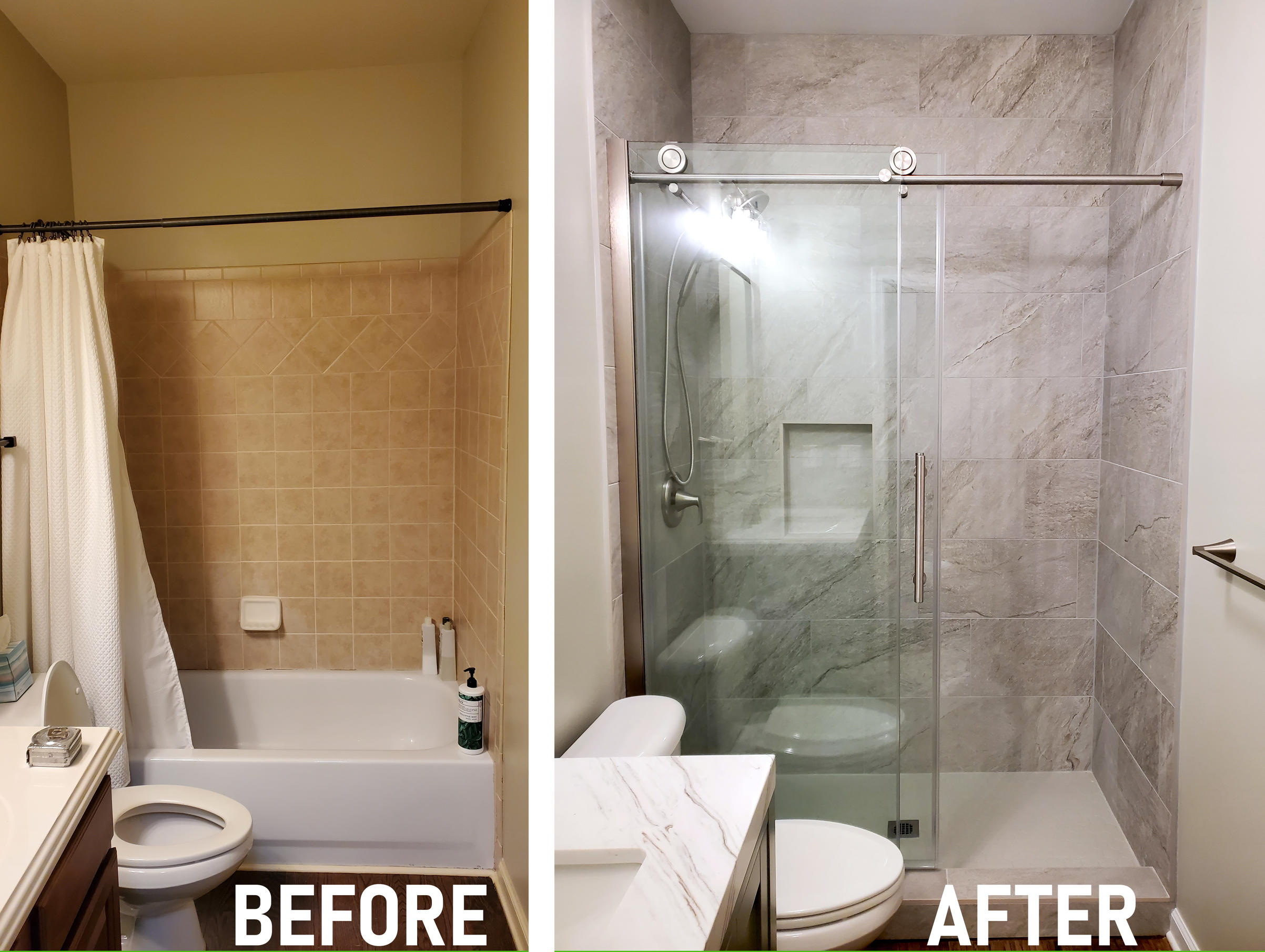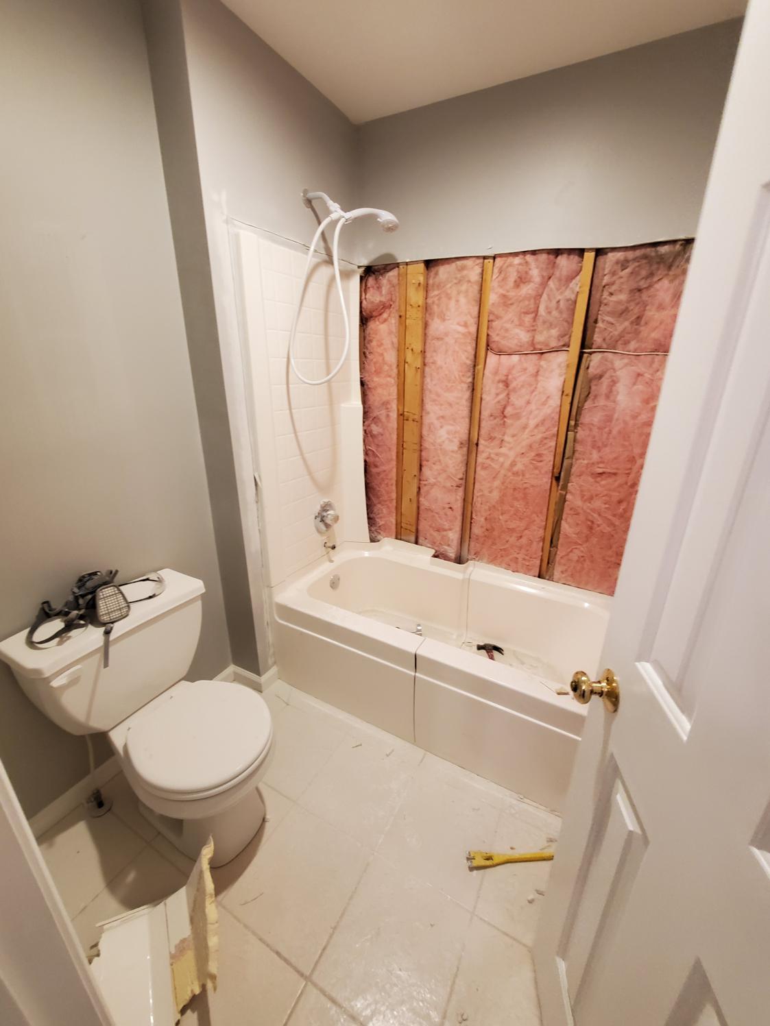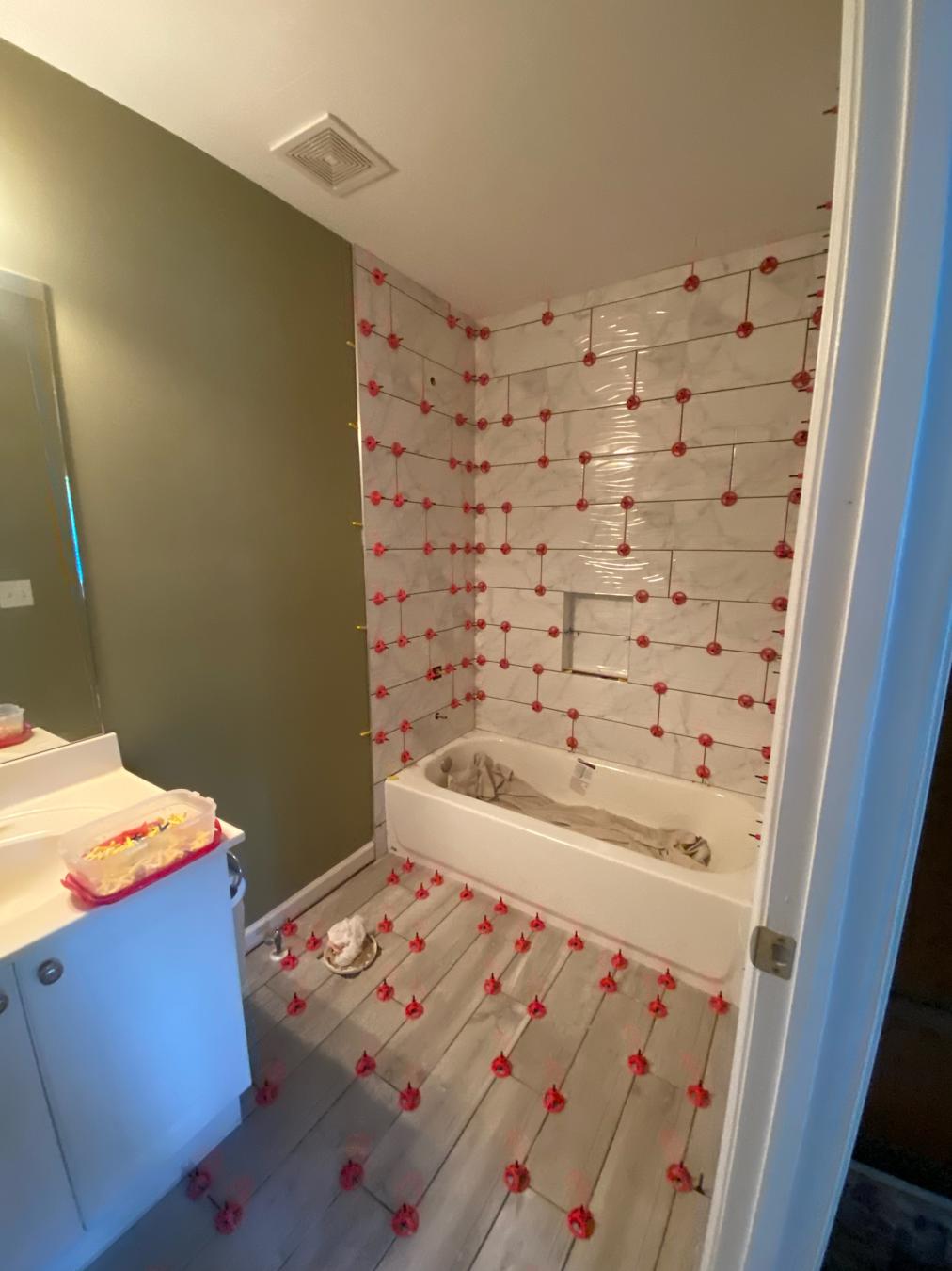 Tub to shower conversion, sliding glass door, new vanity, electrical, plumbing, tile installation, moving drain to center, painting, trims, and more...