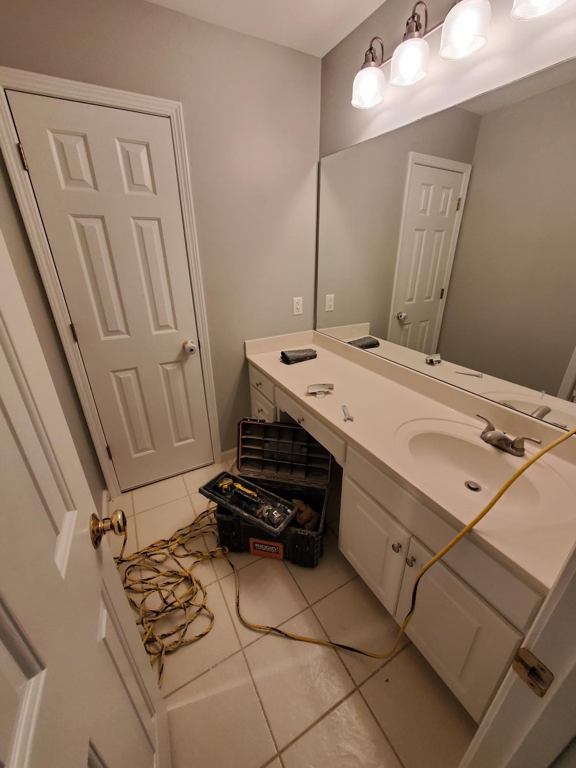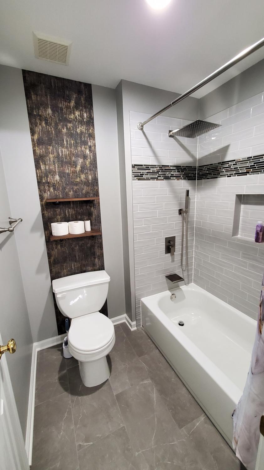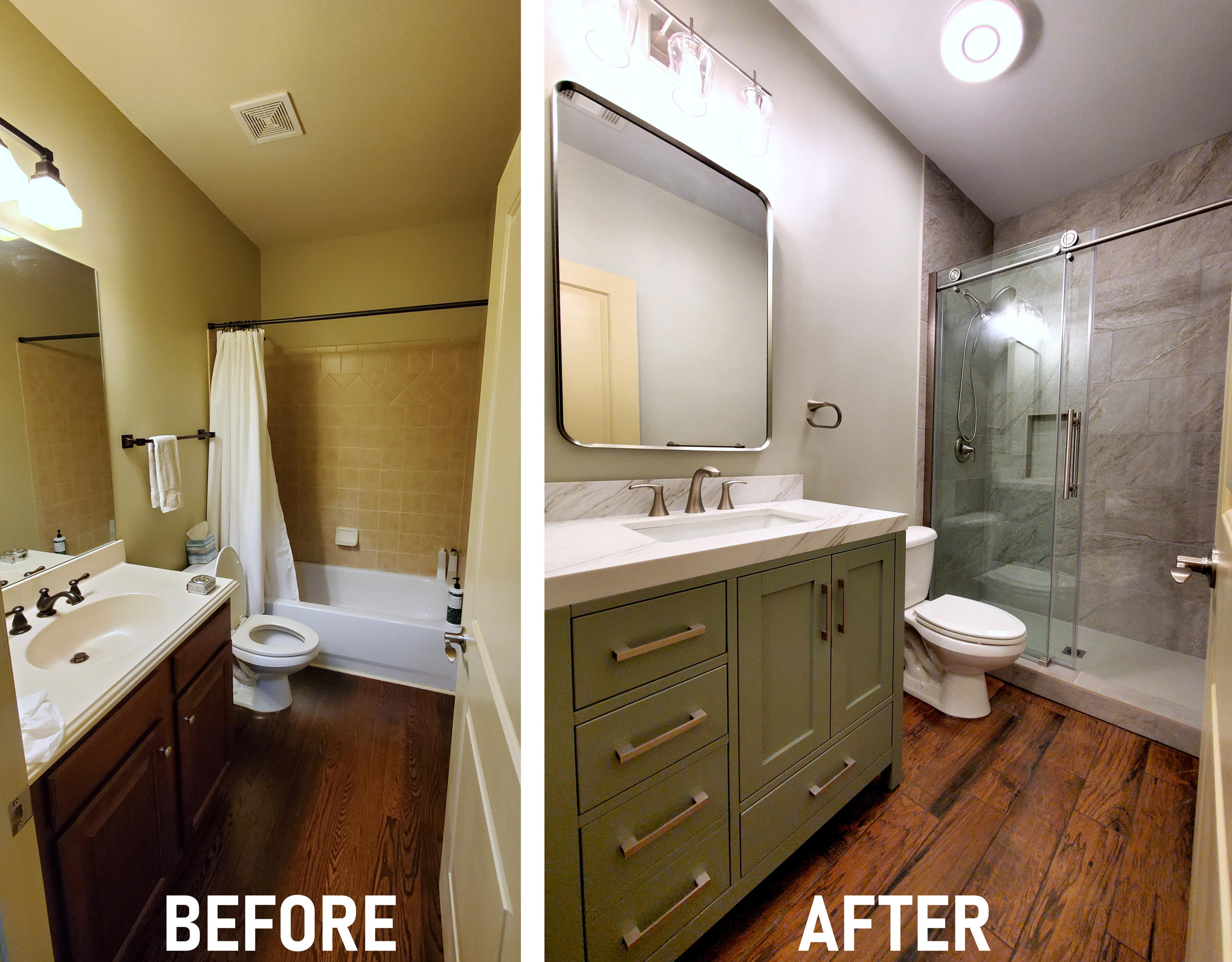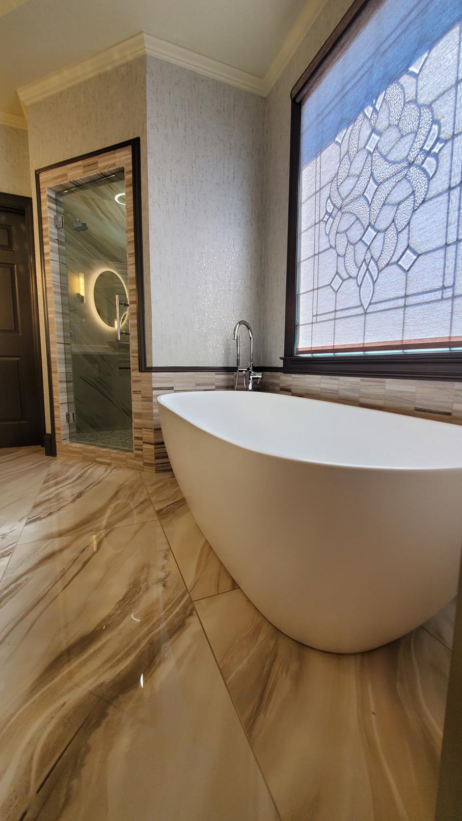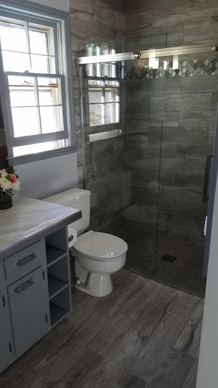Tub to shower conversion, sliding glass door, new vanity, electrical, plumbing, tile installation, moving drain to center, painting, trims, and more...