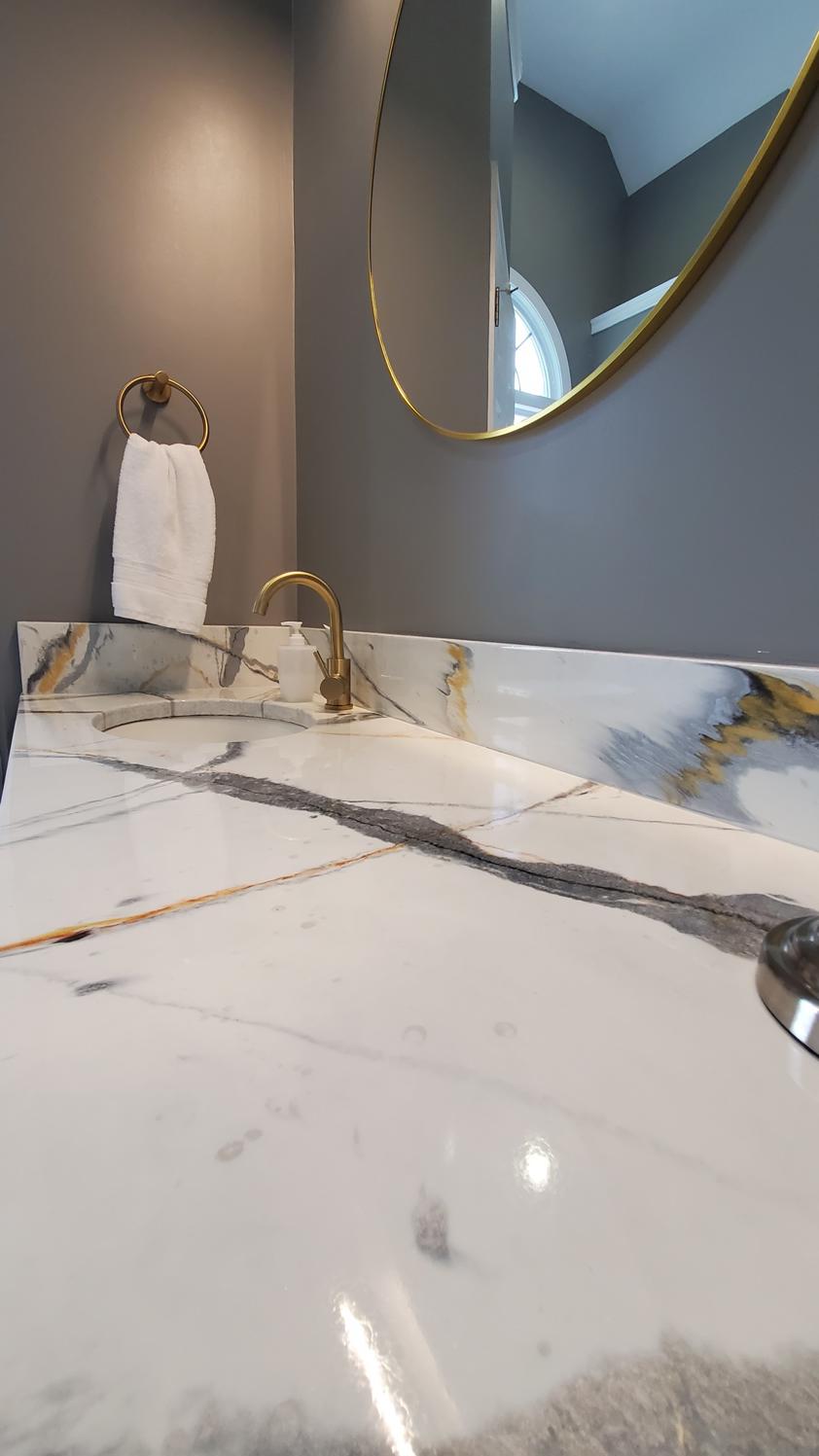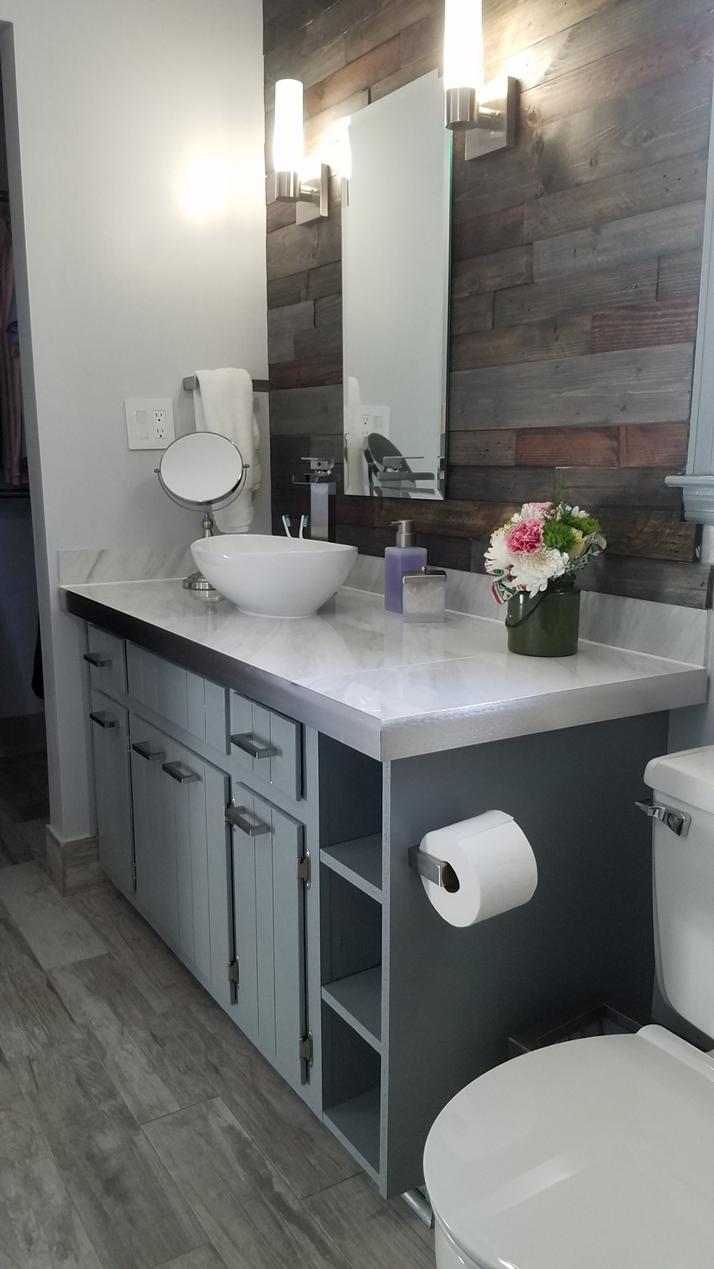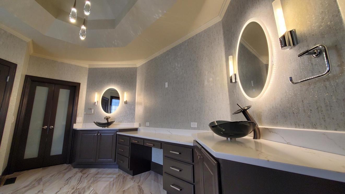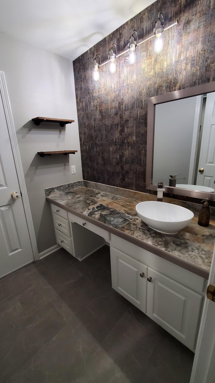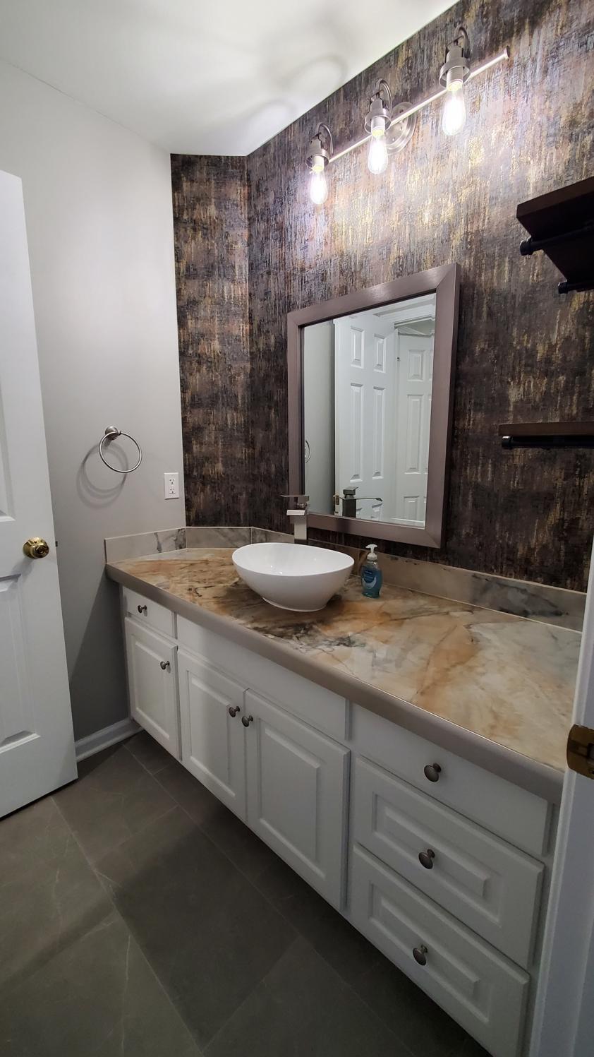 New Countertops, Painted Vanity, Wallpaper, New Tiles and all Fixtures