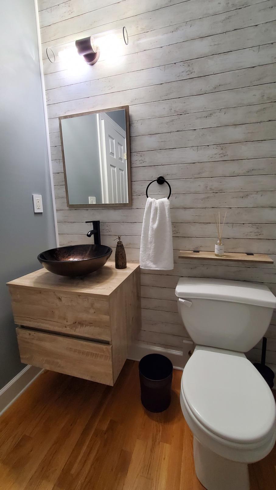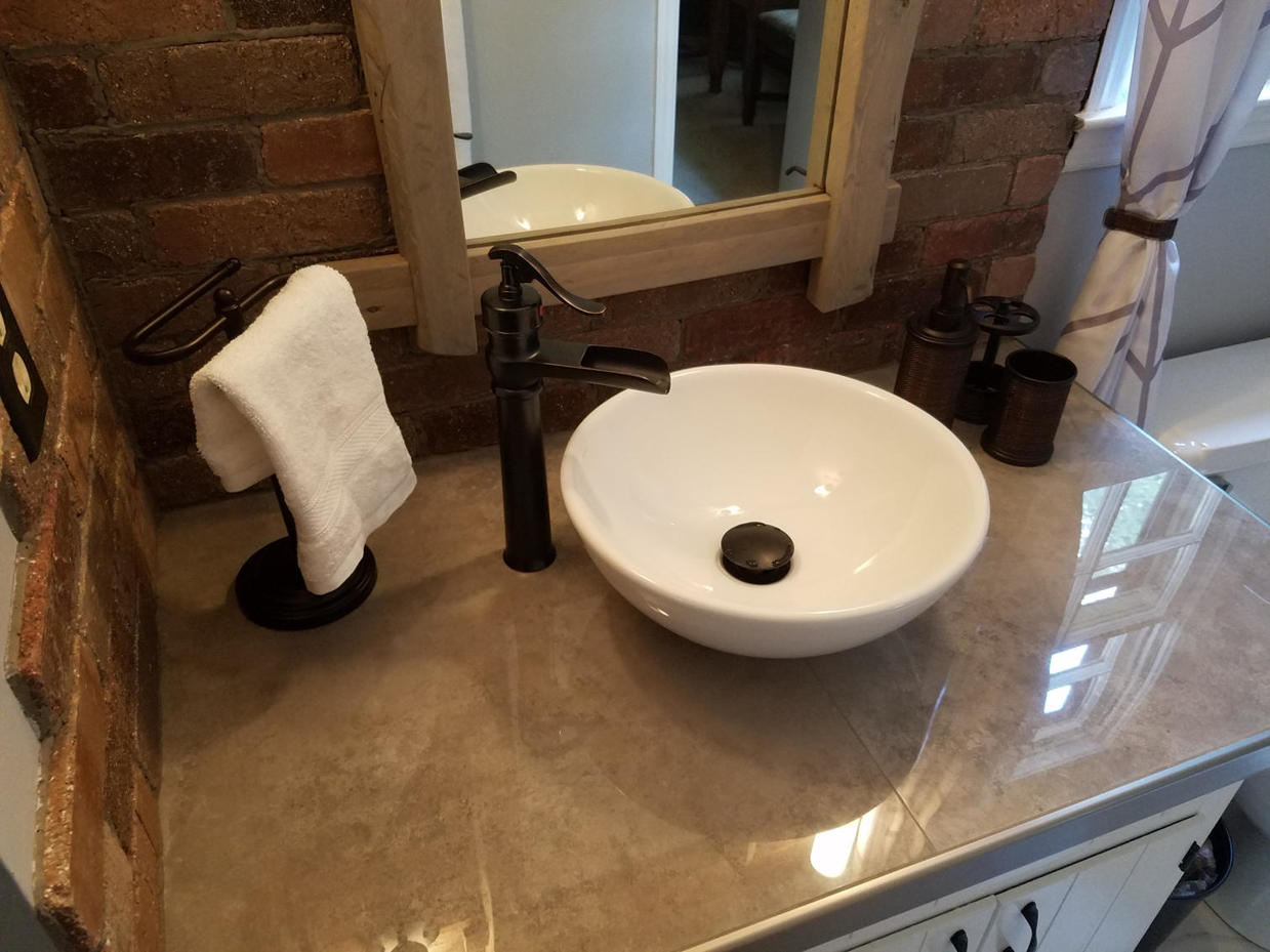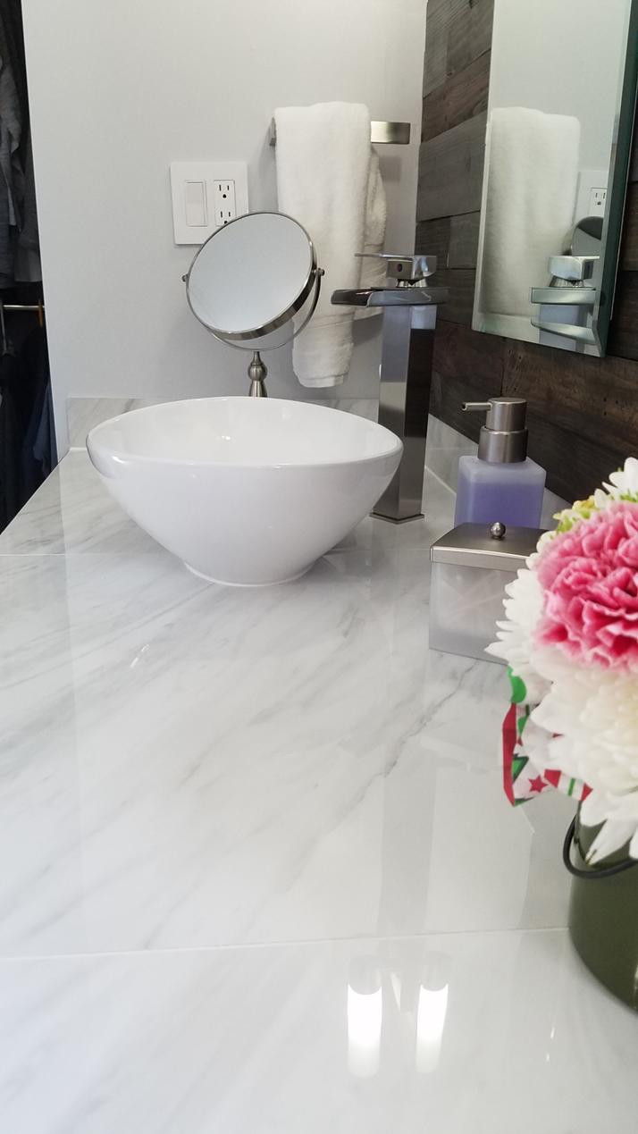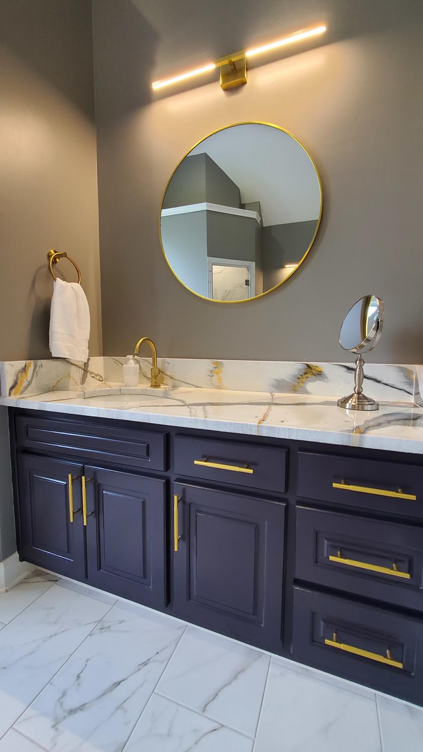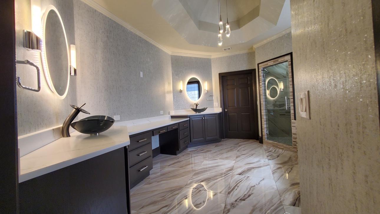 New Countertops, Painted Vanity, Wallpaper, New Tiles and all Fixtures