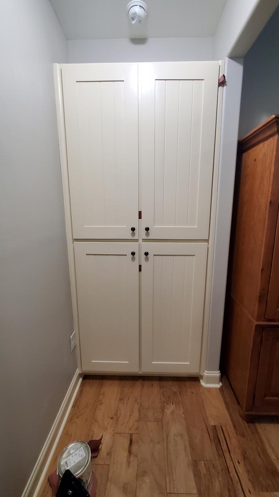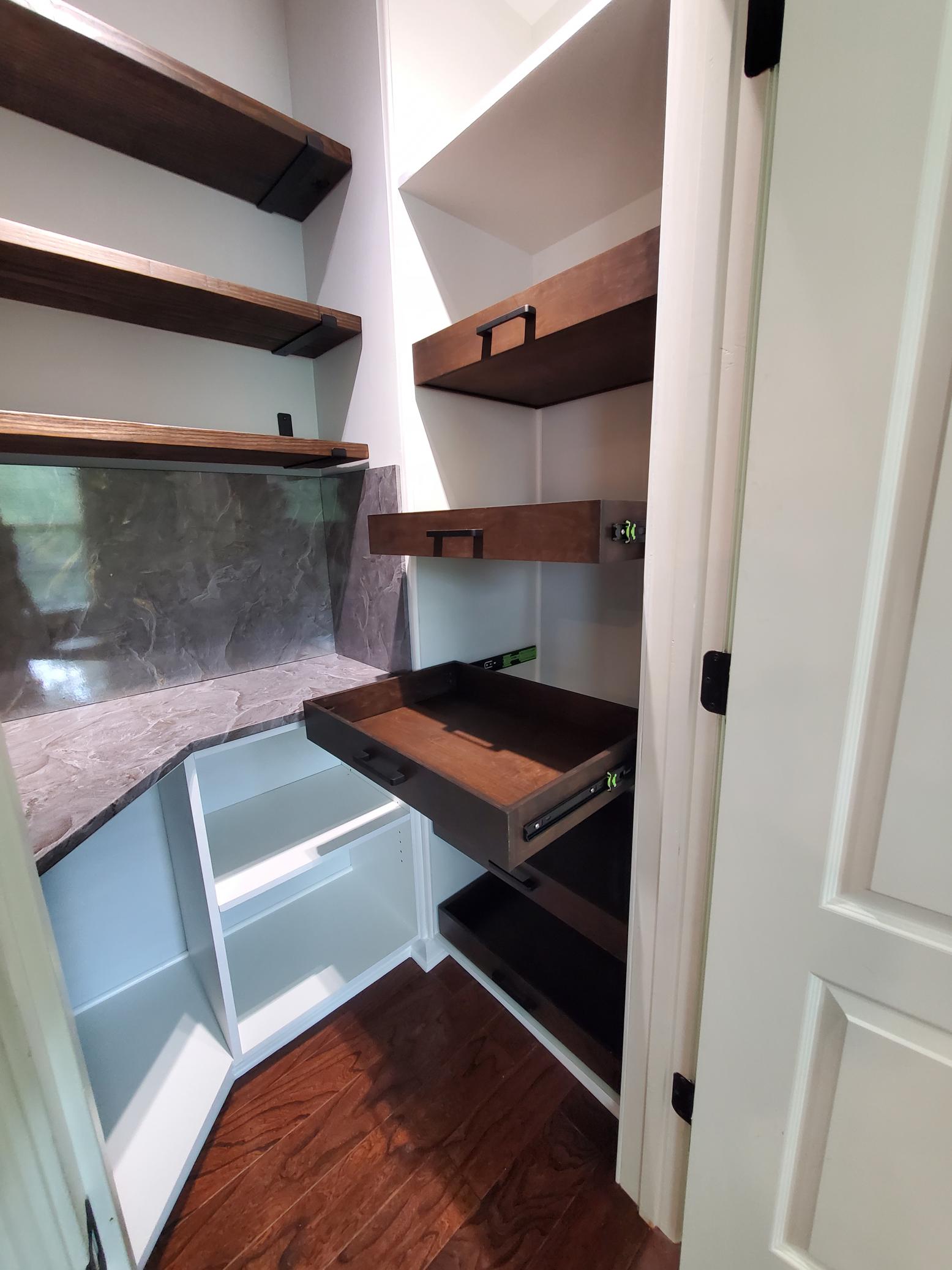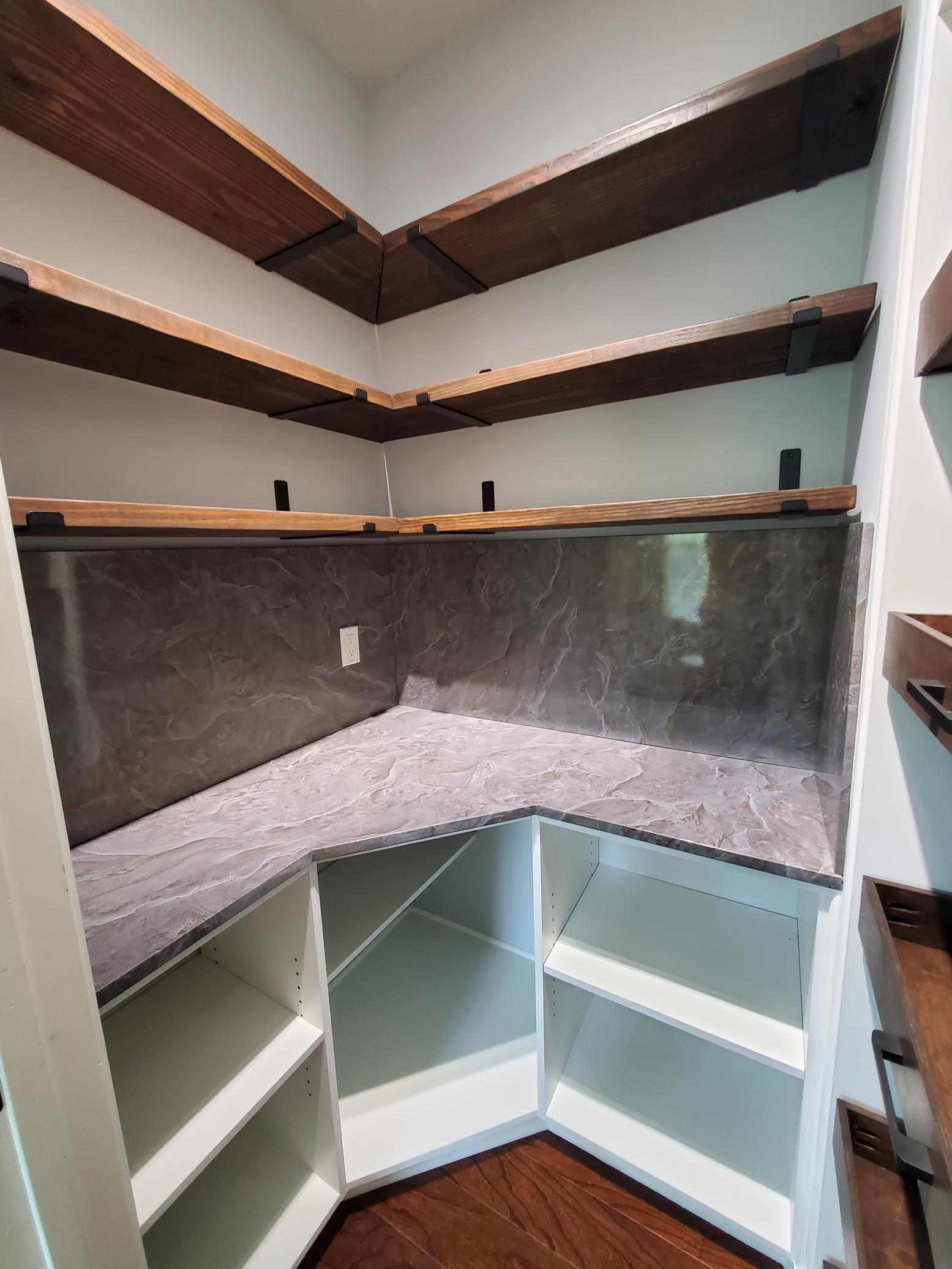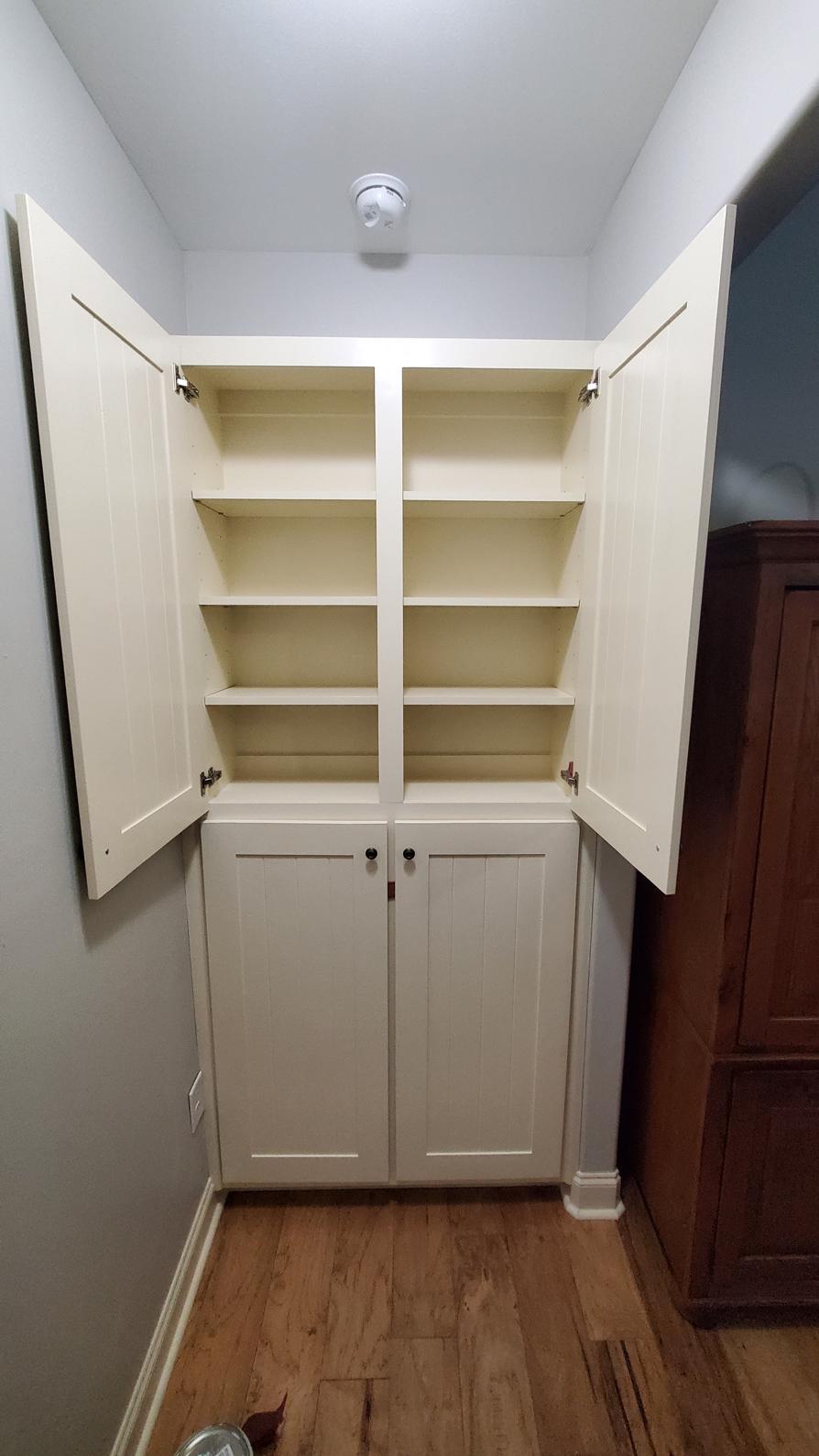 Demo existing shelving & install custom cabinets, countertop, roll-out trays, and shelves, + trim work and paint