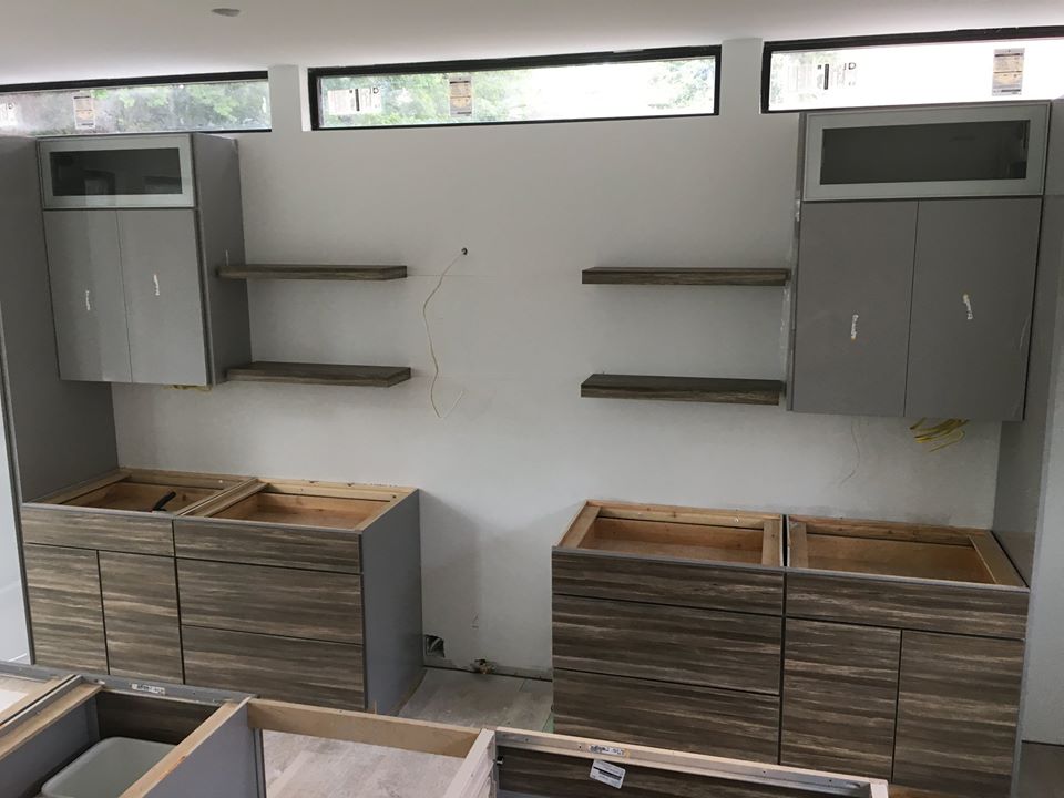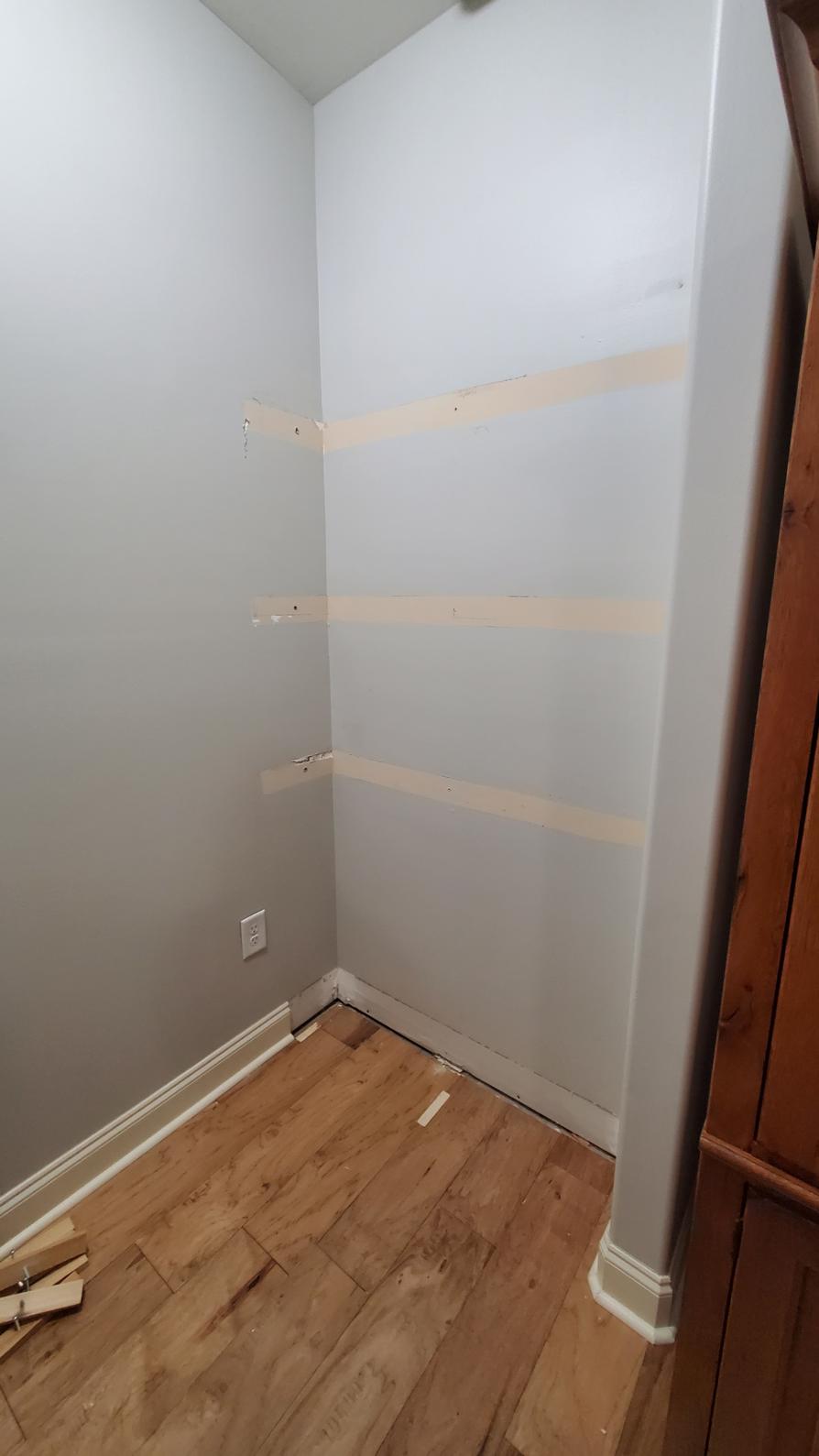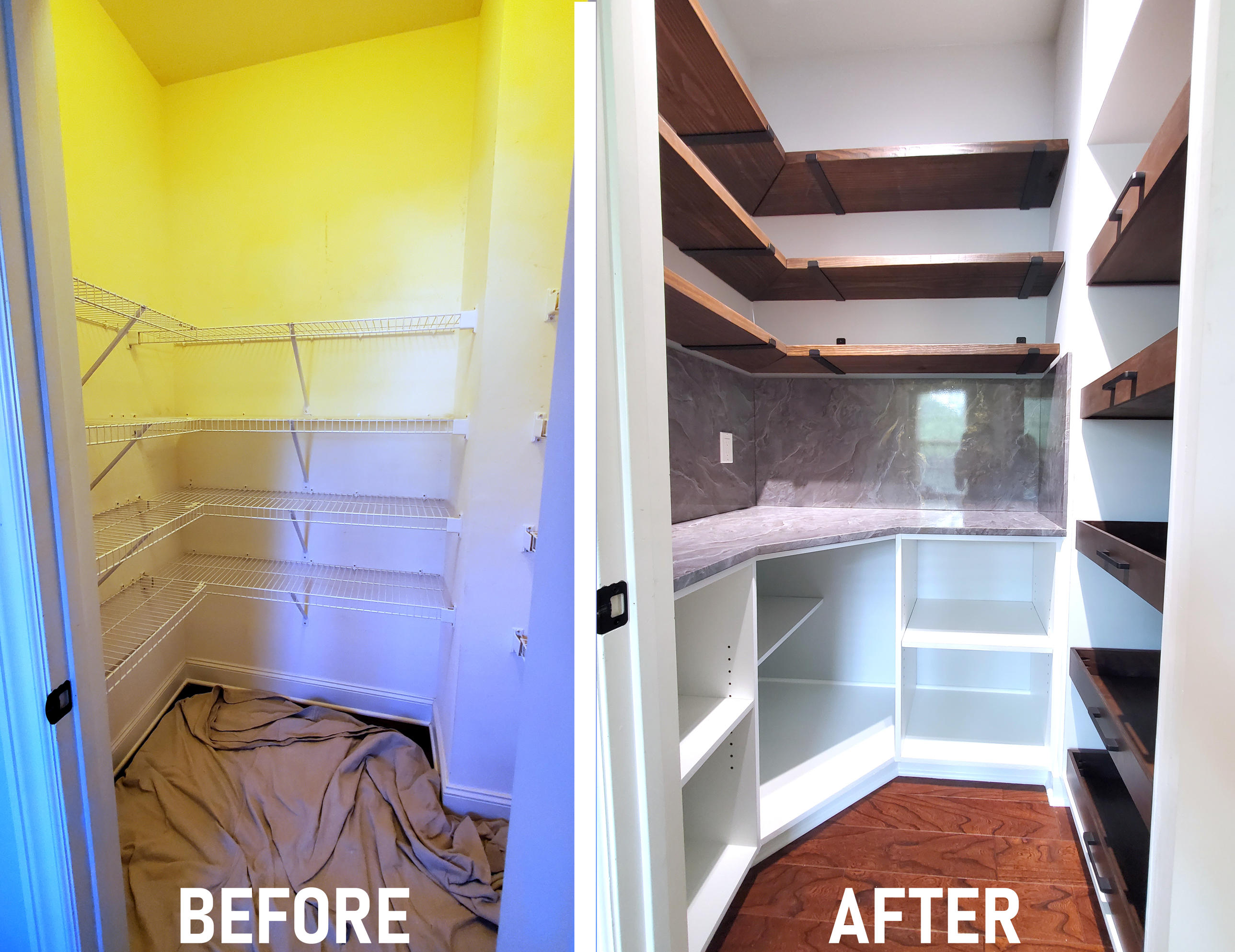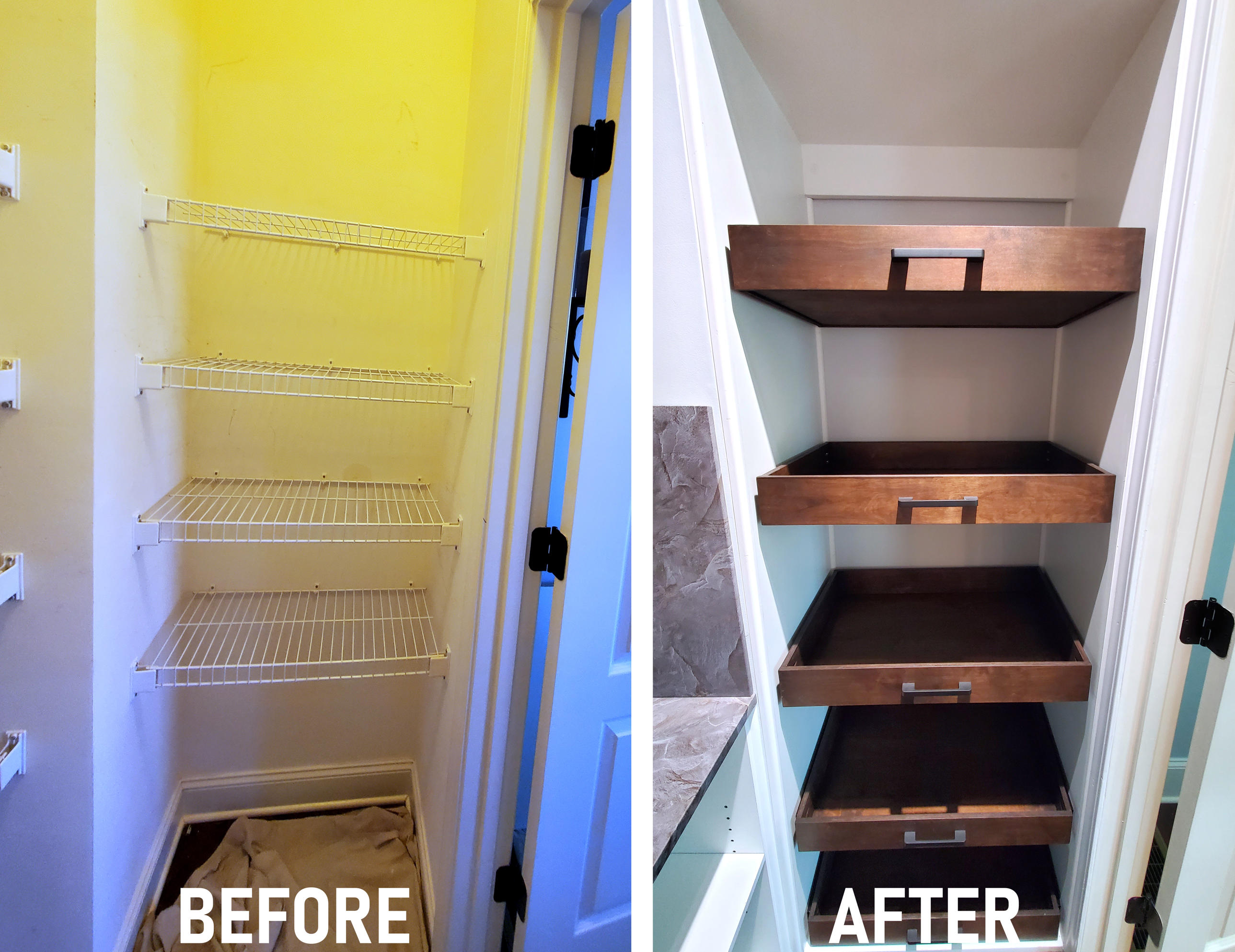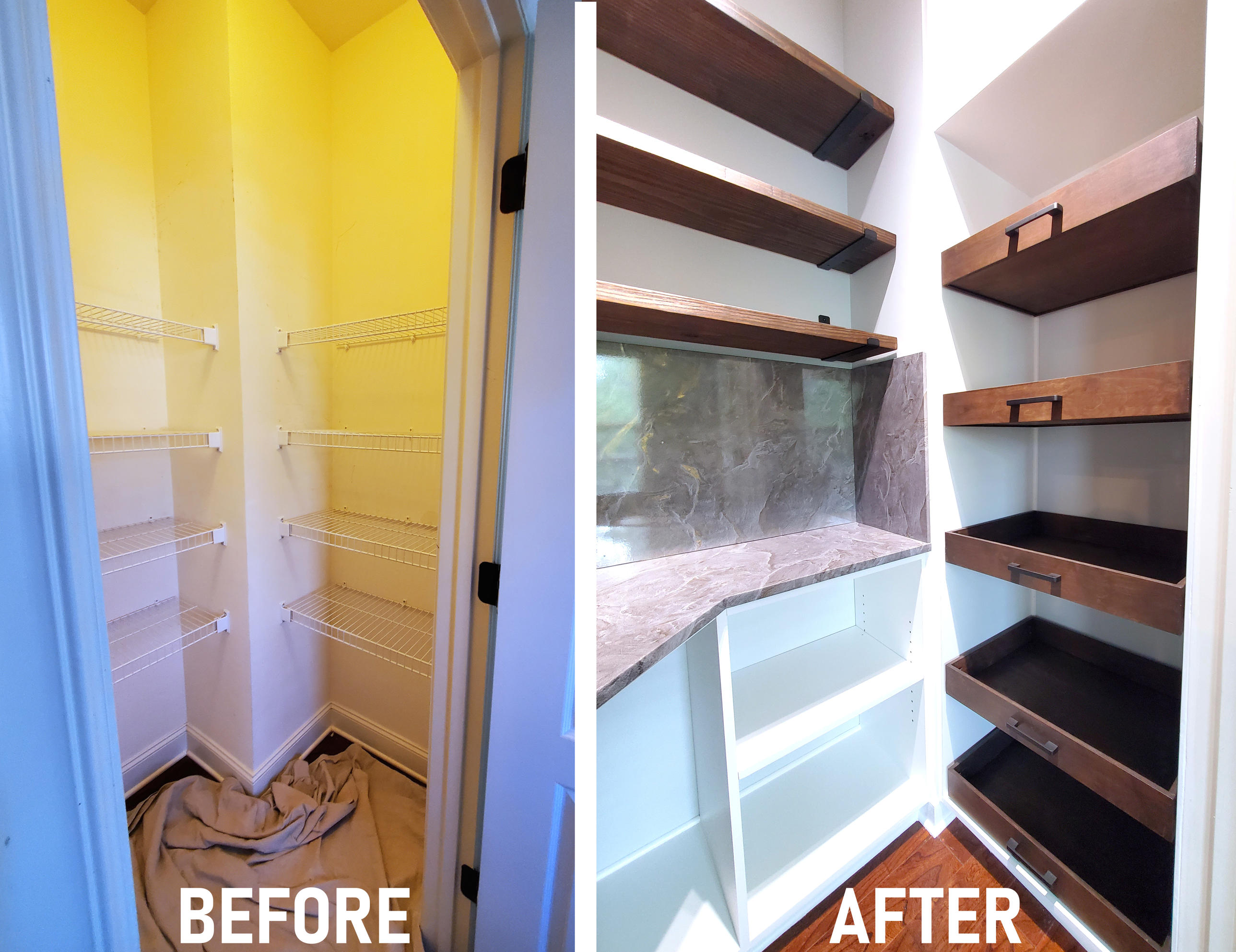 Demo existing shelving & install custom cabinets, countertop, roll-out trays, and shelves, + trim work and paint