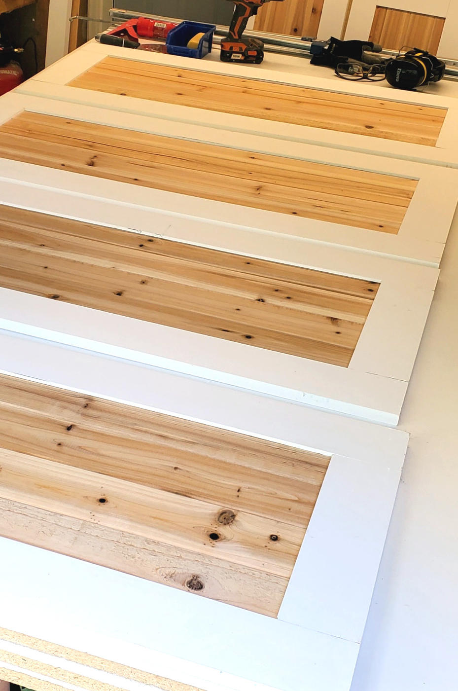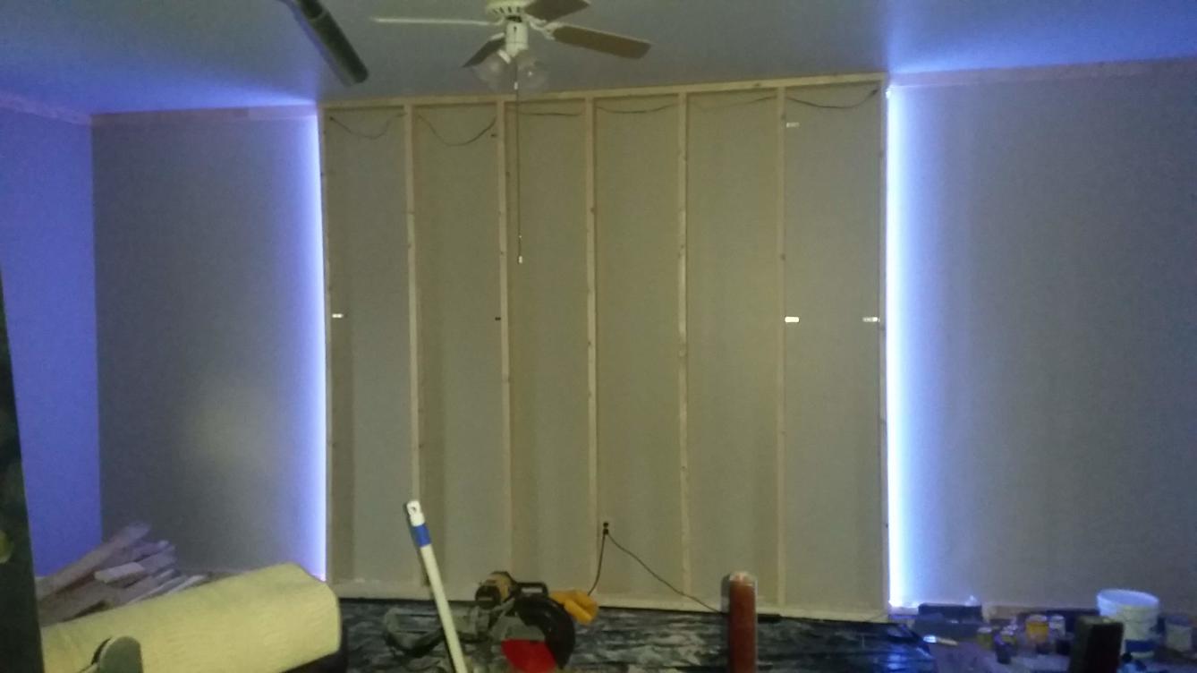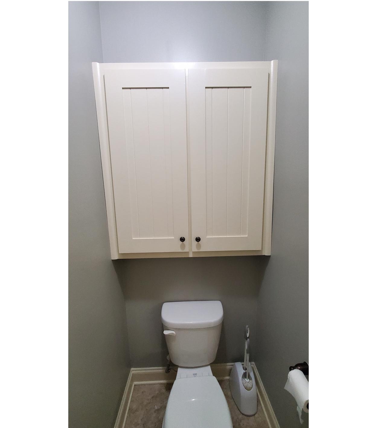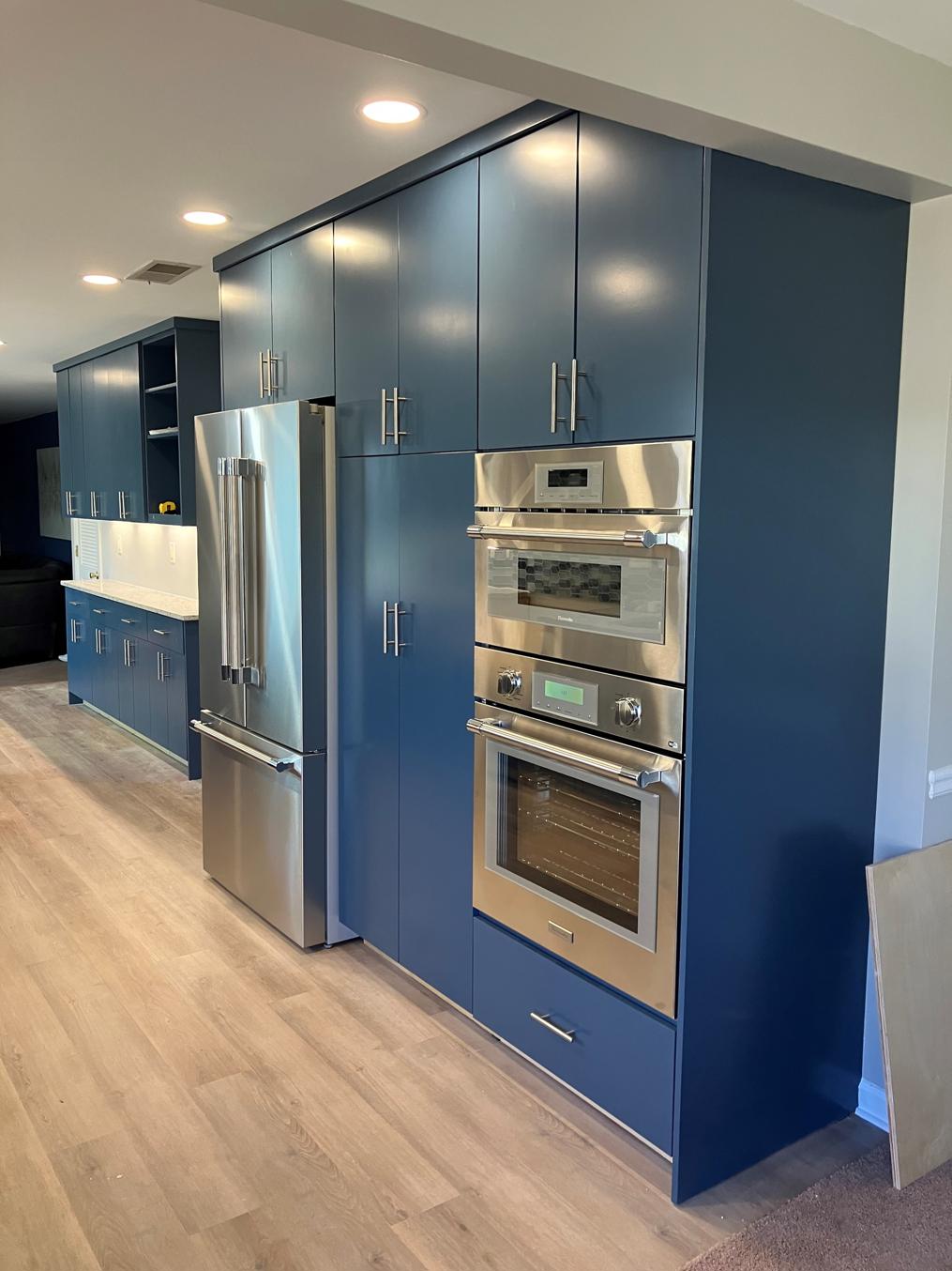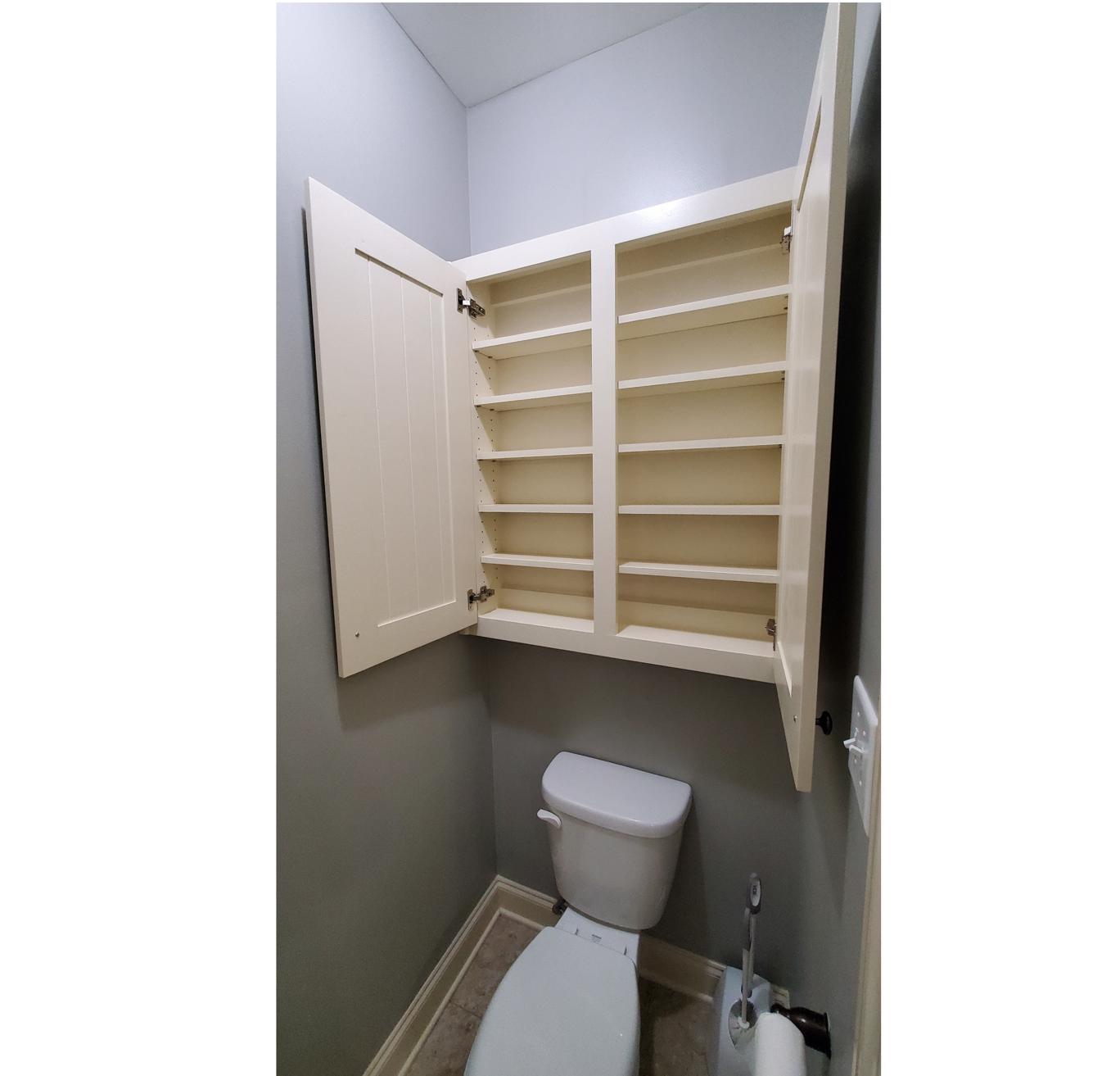 Demo existing shelving & install custom cabinets, countertop, roll-out trays, and shelves, + trim work and paint